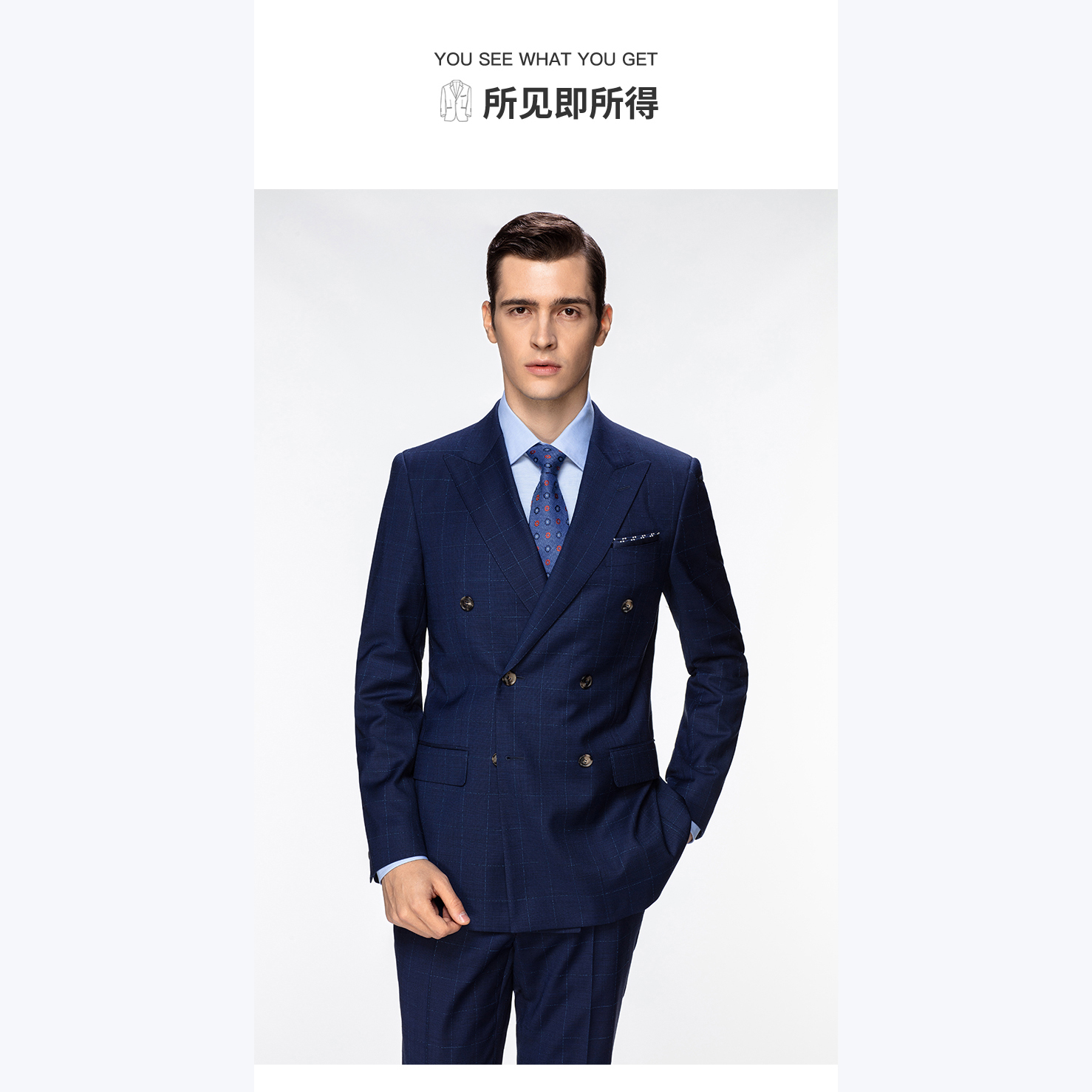 产品编号:红领定制双排扣格纹西服套装男弹力羊毛新款职业装正装男外套西装 50%羊毛 多部位支持单独定制 一人一款