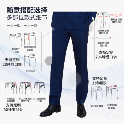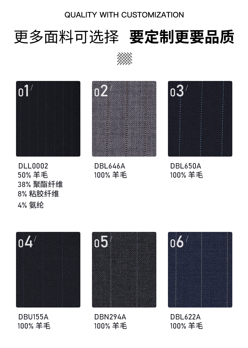 产品编号:红领定制双排扣条纹西服套装藏青色戗驳领商务正装男羊毛混纺外套 羊毛50% 聚酯纤维38% 粘胶纤维(粘纤)8% 聚氨酯弹性纤维(氨纶)4%